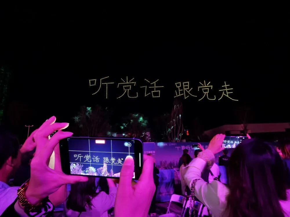 ?當晚21時許,千架無人機編隊以天空為幕,以“熒光”為筆,由飄動的紅綢、黨徽、1921-2021字符組合的圖案率先在夜空中亮相。而后,無人機編隊組合出“不忘初心 牢記使命”“聽黨話 跟黨走”一句句鏗鏘有力的話語,引得現場觀眾連連贊嘆。蘭州城市地標圖案中山橋、奧體中心、萬達茂隨后也紛紛驚艷亮相,與星空共舞,把當晚金城夜空描繪得璀璨而華麗。