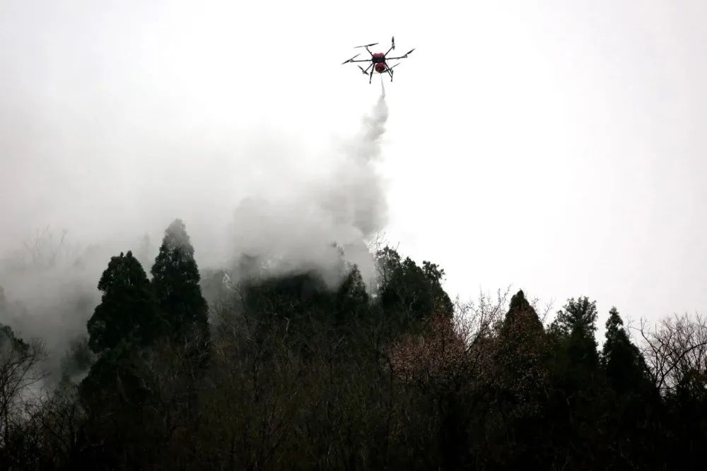 在演練現(xiàn)場,在主持人一聲號令后,一臺華科爾消防無人機WK1800起飛,不到1分鐘的時間,無人機已飛抵1公里外的小山丘上。一股白色煙霧從無人機底部噴涌而出,迅速擴散至整個山丘。