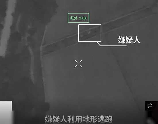 東陽警方安排搜捕組前往交易地點進行圍捕,首次抓捕過程中,嫌疑人非常警覺,發現了異常,利用地形優勢逃離交易點。指揮部結合地面警力部署和無人機回傳畫面進行綜合研判,指揮空中偵查組重點偵查灌溉渠、灌木叢方向。無人機通過紅外熱成像模式發現移動熱源,經與地面警力溝通,確認為嫌疑人。因警方早已在嫌疑人可能竄逃的方向部署了蹲守組,指揮部安排地面警力順勢擠壓驅趕,讓抓捕范圍進行圈內收縮,迅速實施第二次圍捕行動。