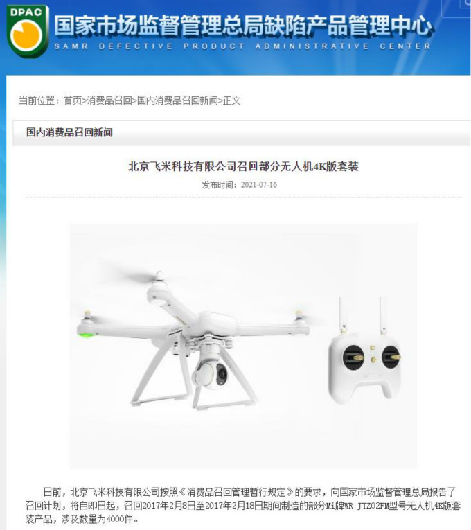 【環(huán)球網(wǎng)無人機(jī)綜合報(bào)道】國家市場監(jiān)督管理總局7月16日消息,日前,北京飛米科技有限公司按照《消費(fèi)品召回管理暫行規(guī)定》的要求,向國家市場監(jiān)督管理總局報(bào)告了召回計(jì)劃,將自即日起,召回2017年2月8日至2017年2月18日期間制造的部分Mi牌WR JTZ02FM型號(hào)無人機(jī)4K版套裝產(chǎn)品,涉及數(shù)量為4000件。