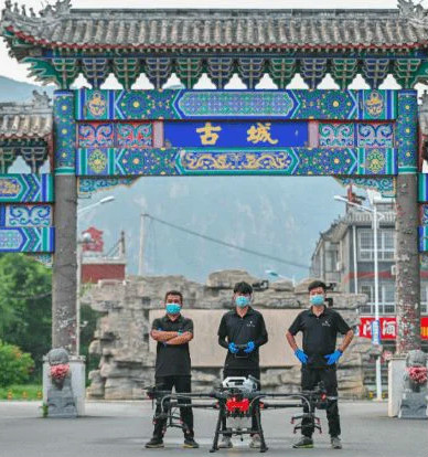 2020年以來,吳海寧(中)和同事們共同組成一支無人機消殺團隊,為延慶上百個村莊進(jìn)行了防疫消殺。