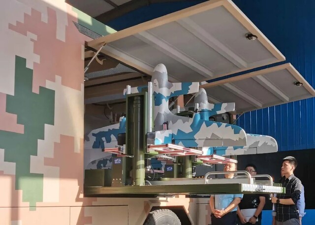 無人機載發車可實現38秒內完成整套設備的快速部署:4架尾座式垂直起降固定翼、1架四旋翼無人機。車頂航空式艙門設計,采用升降式平臺自動化控制無人機運輸固定、舉升出艙和起飛;利用單側拓展方艙和托舉平臺,實現無人機的停放、托舉和回填。